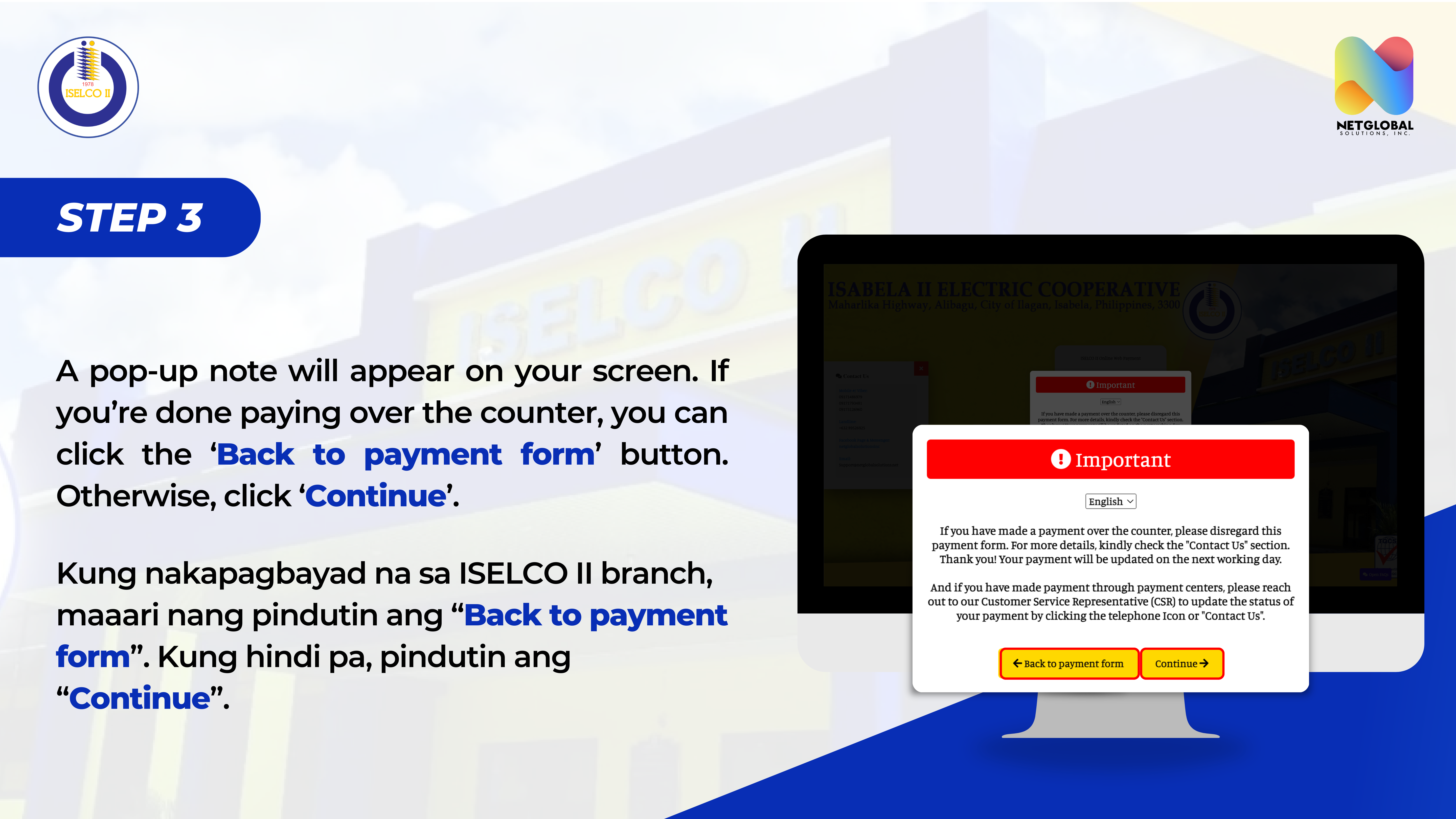 Hindi ka maaaaring makapagbayad online kung ang iyong account ay nakatanggap ng "Disconnection Letter". Kailangan mong magbayad sa pinakamalapit na branch ng ISELCO II.